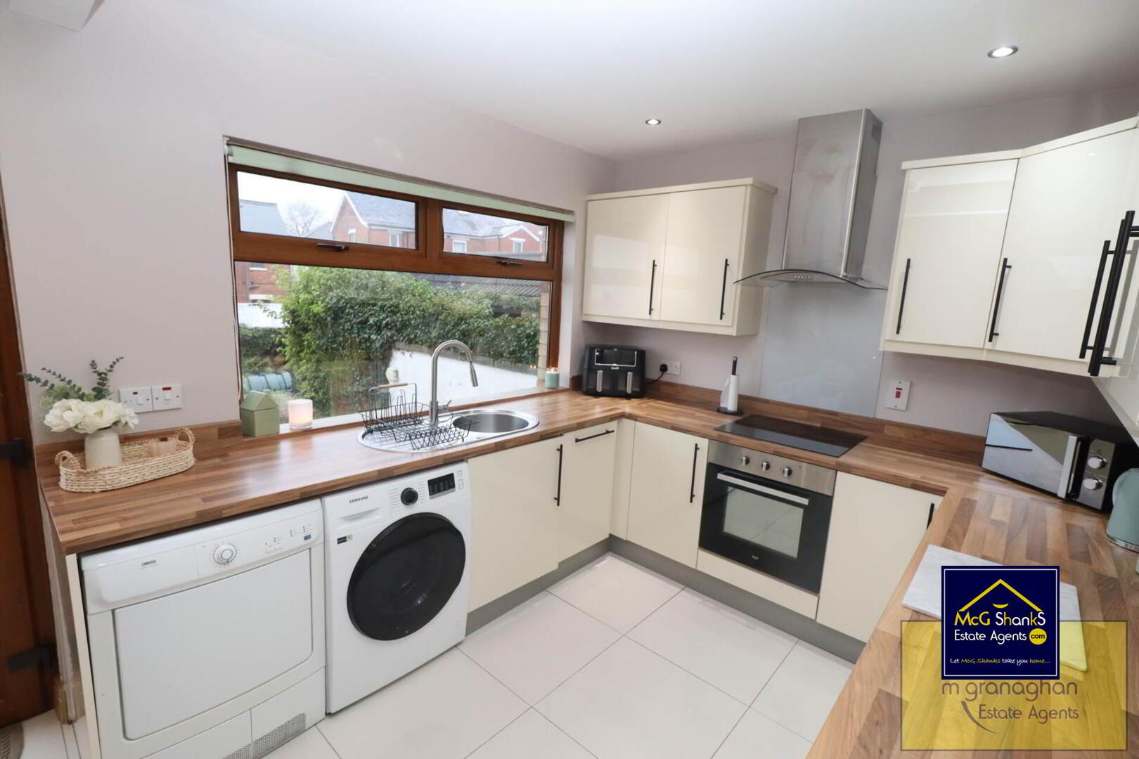 Cream gloss kitchen with a range of high and low level units, formica work surfaces, stainless steel sink drainer, ceramic hob with stainless steel overhead extractor fan, built in oven, integrated fridge freezer, plumbed for washing machine, ceramic tiled floor, access to rear