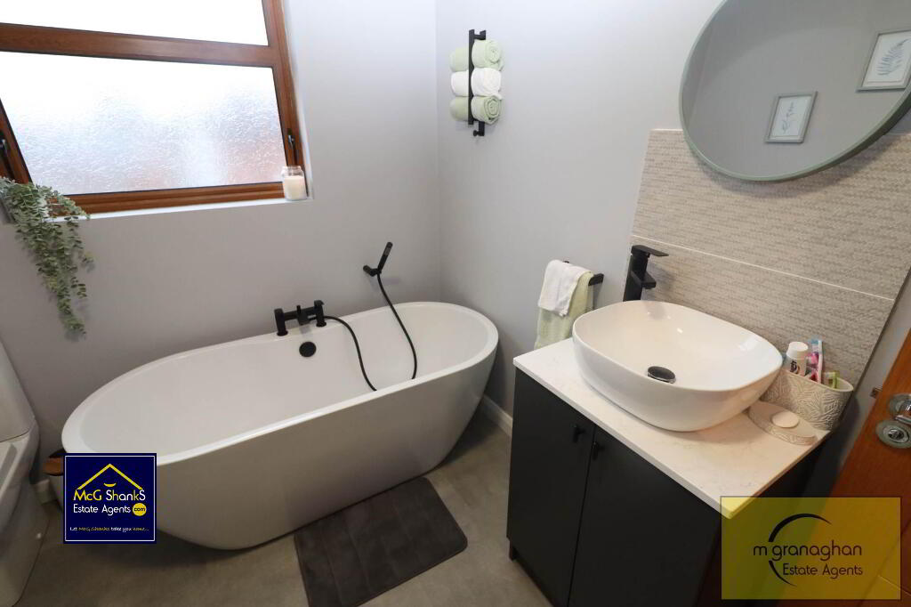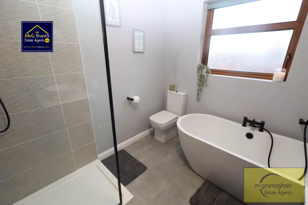 Upstairs, the property comprises three well-proportioned bedrooms, each benefiting from double glazing and gas central heating, ensuring warmth and comfort throughout the year. The bathroom is tastefully finished with modern fixtures, including a free standing bath as well as walk in shower, a wash basin, and a WC, all presented in a clean and contemporary style.