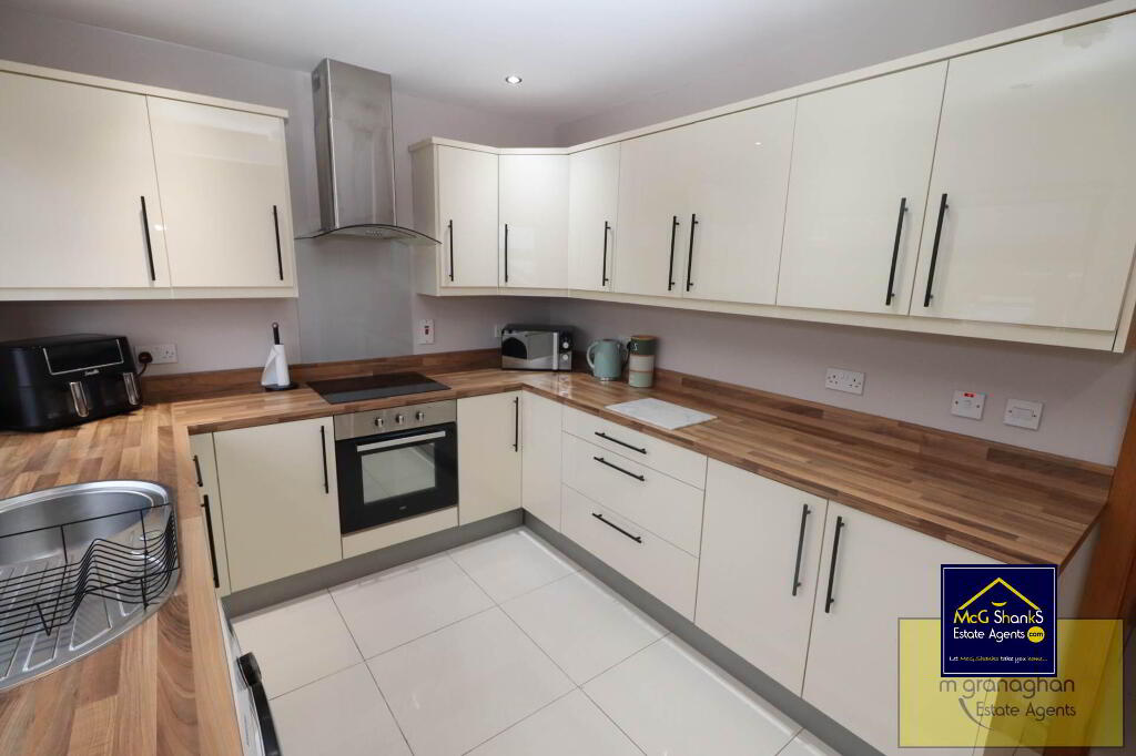 The kitchen is thoughtfully designed with a range of fitted units, offering plenty of storage and work surface area, perfect for culinary enthusiasts. Adjacent to the kitchen, a door leads out to a private garden, an ideal outdoor space for al fresco dining, gardening, or simply unwinding in a peaceful setting.
