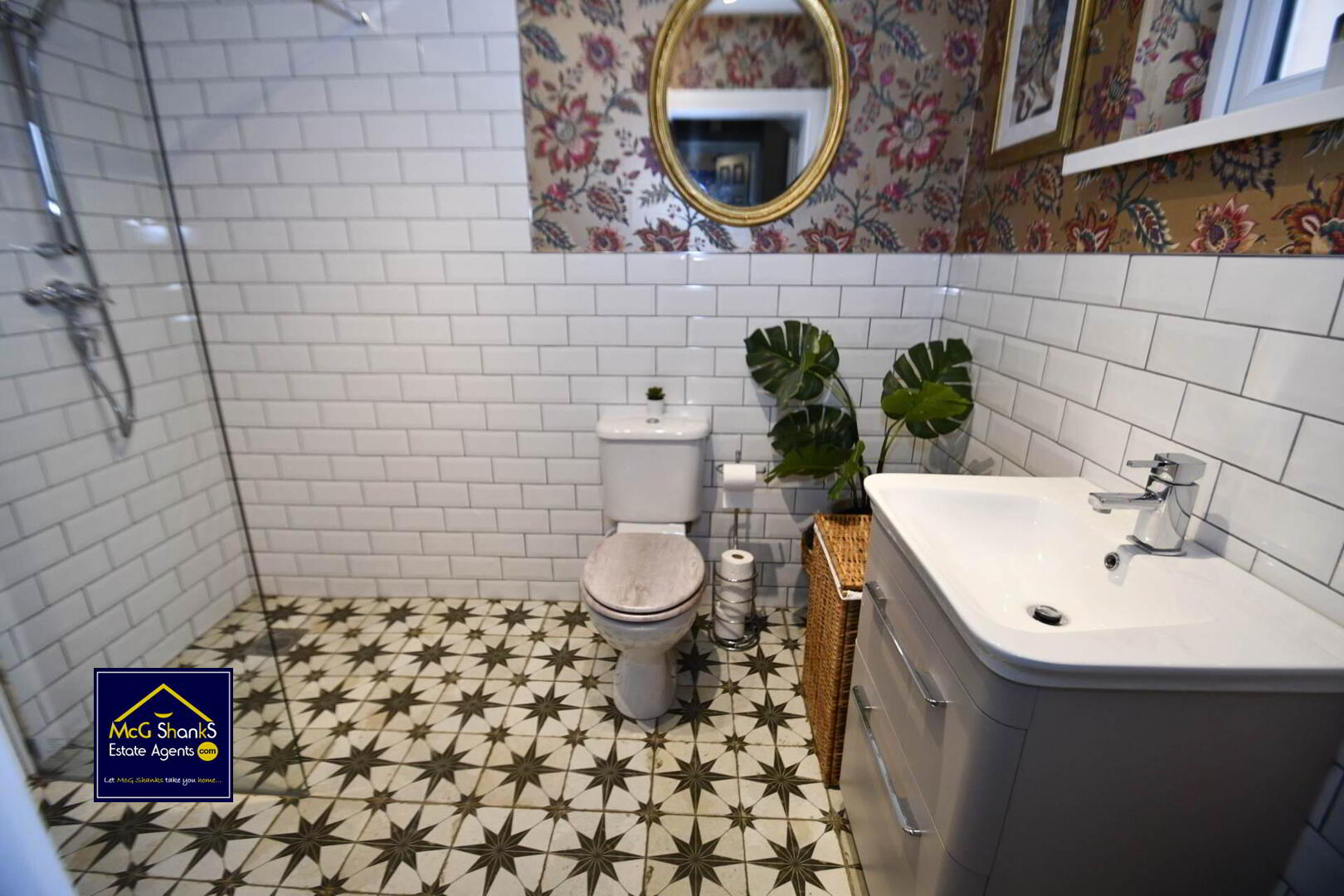 Leads to utility room, walk in shower, vanity unit wash hand basin, low flush W/C, chrome towel towel rail, part tiled walls, ceramic tile flooring