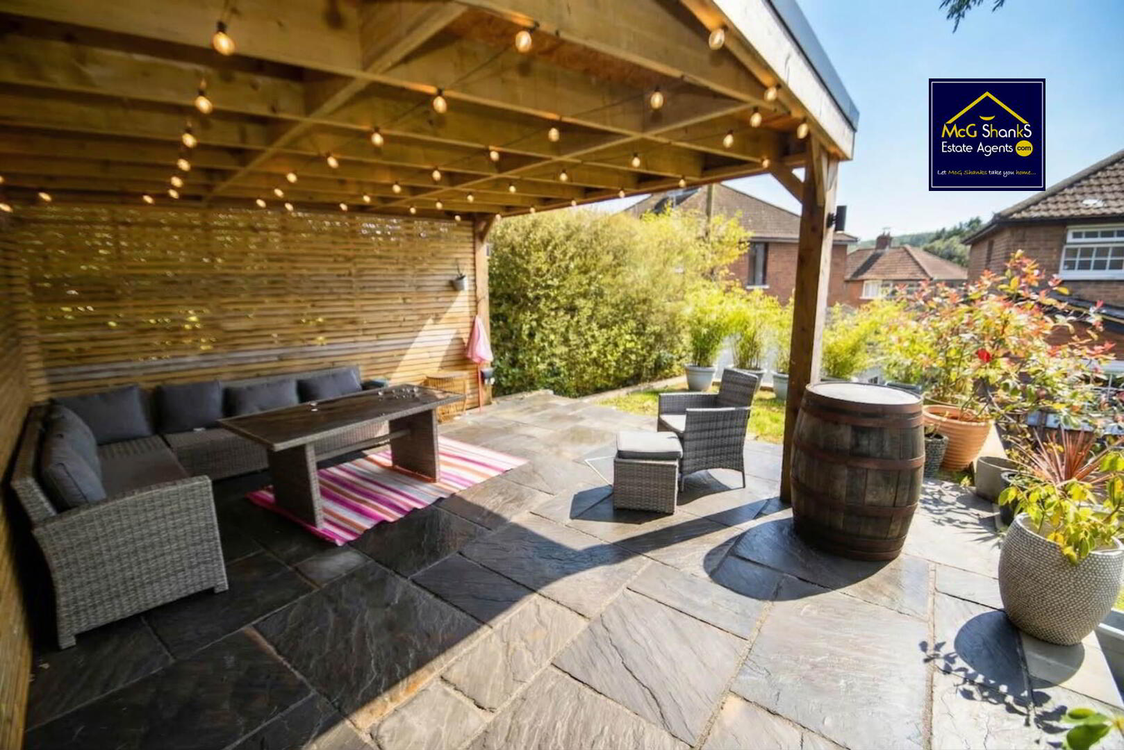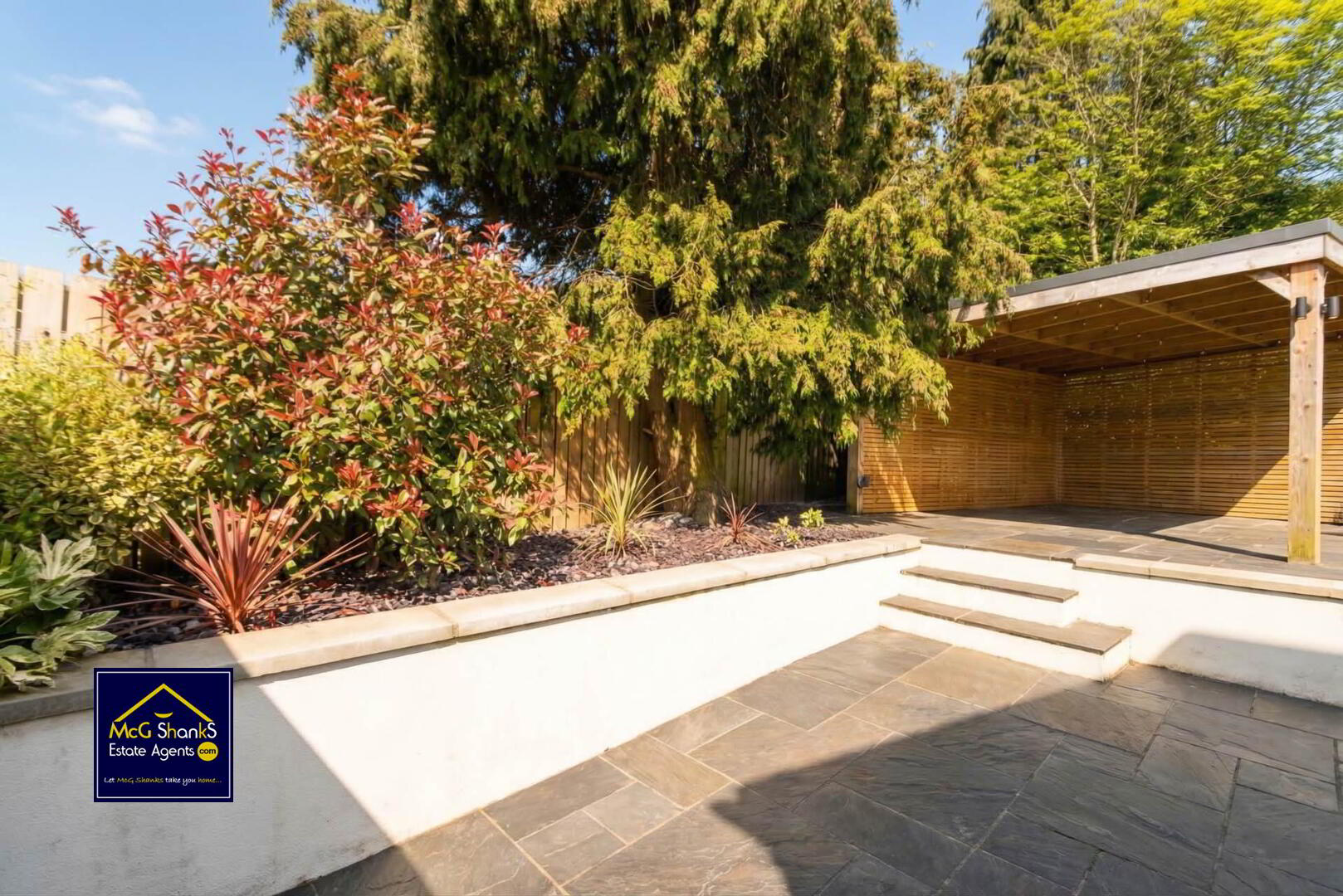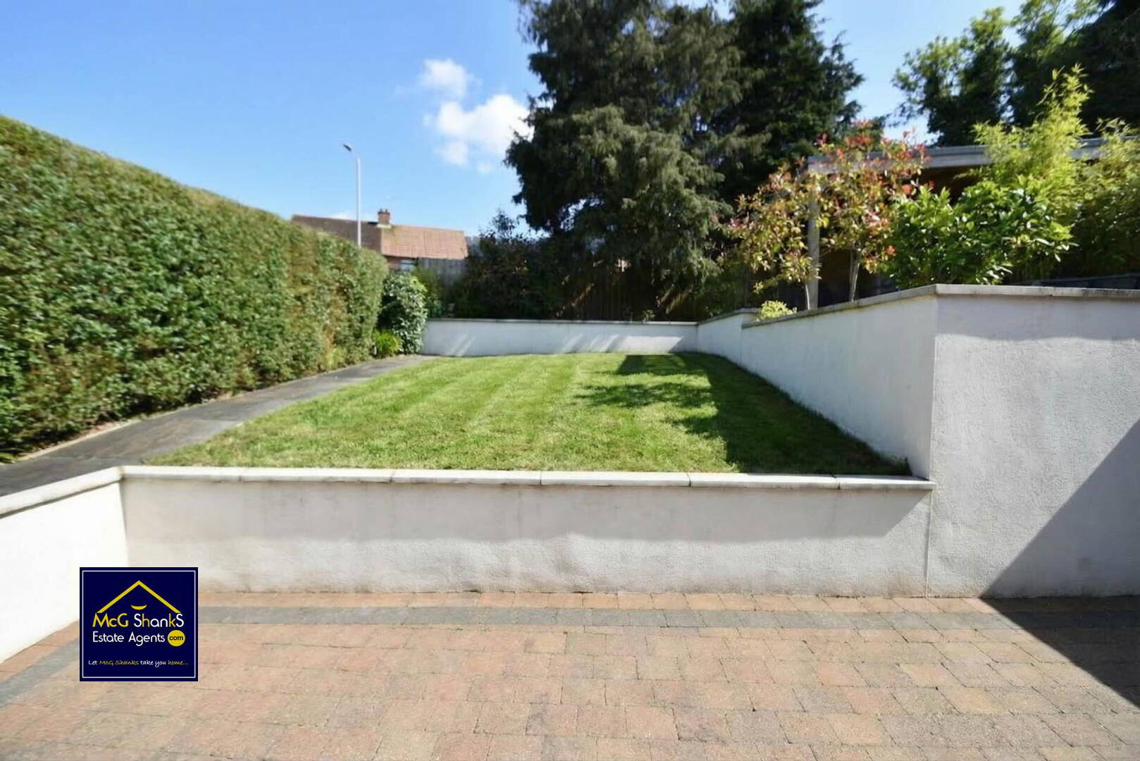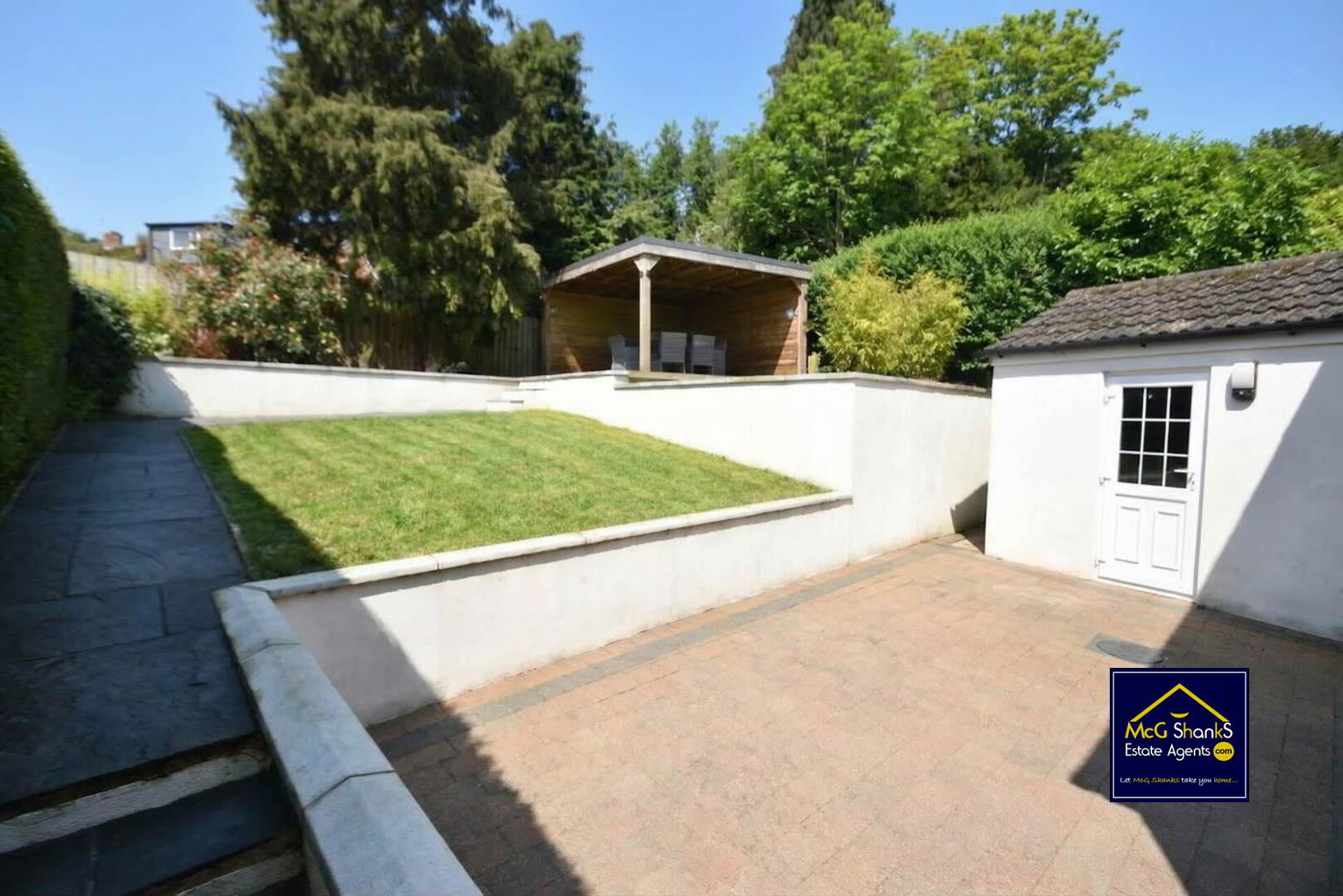 Fully enclosed split level garden with easily maintained lawn & patio area, with delightful sitting area