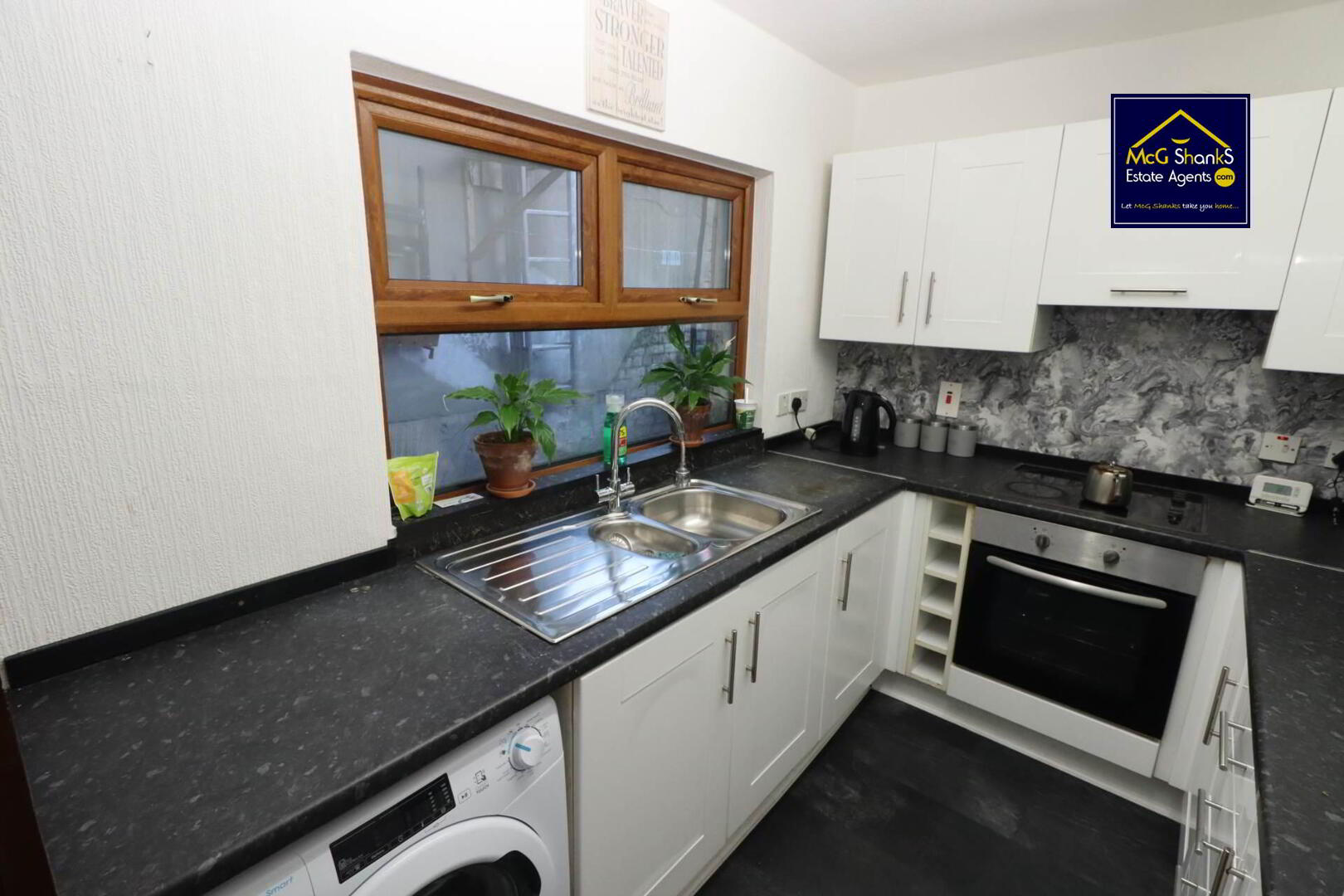Range of high & low level units, formica work surfaces, stainless steel sink drainer, integrated hob, plumb for washing machine