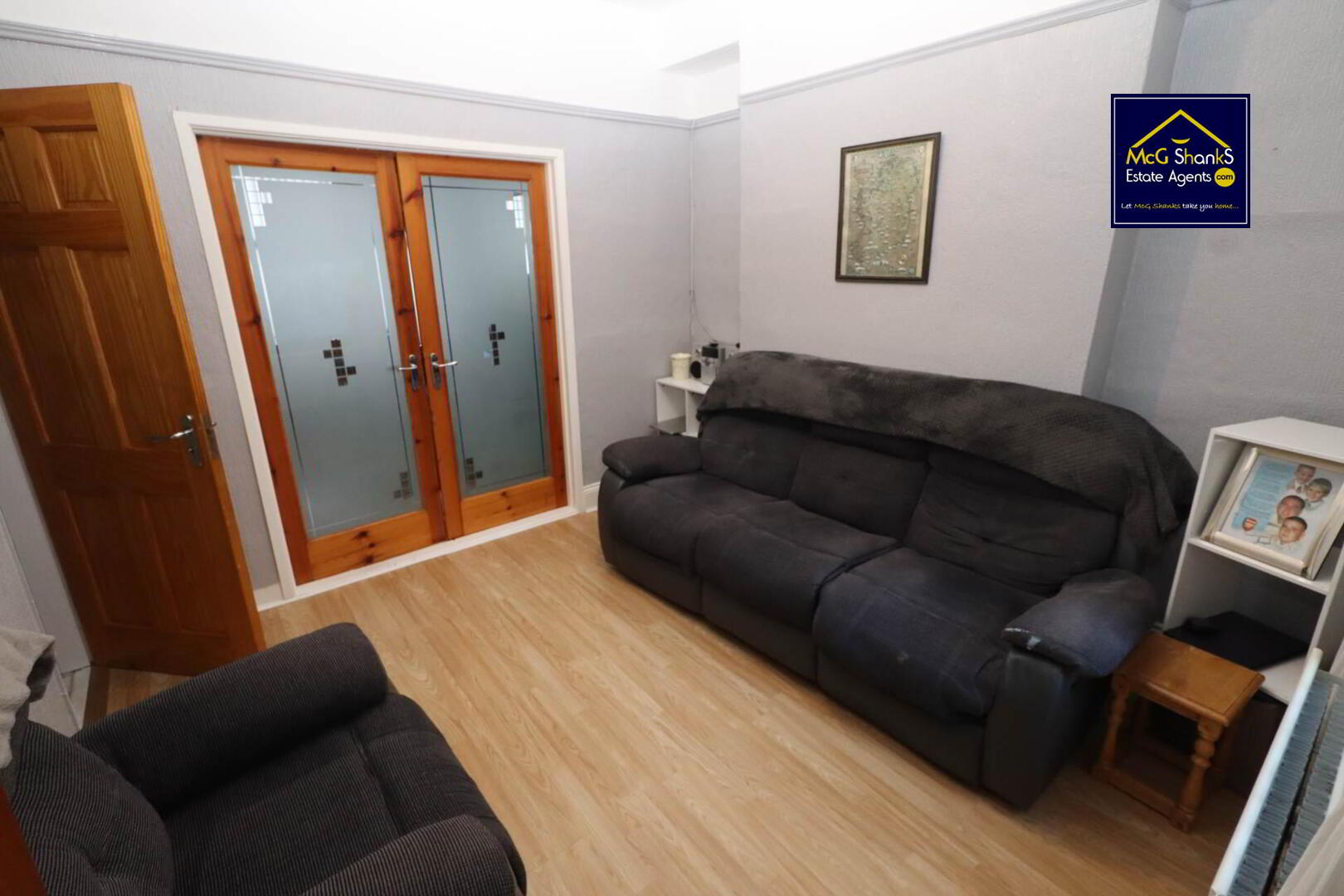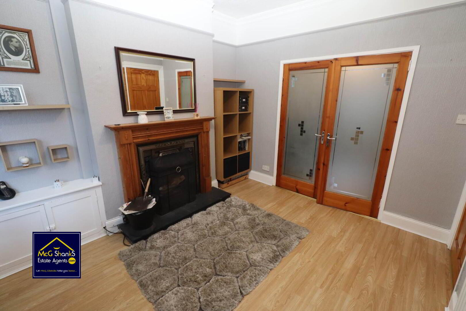 Bay window, feature fire place, laminate flooring, double doors to second reception