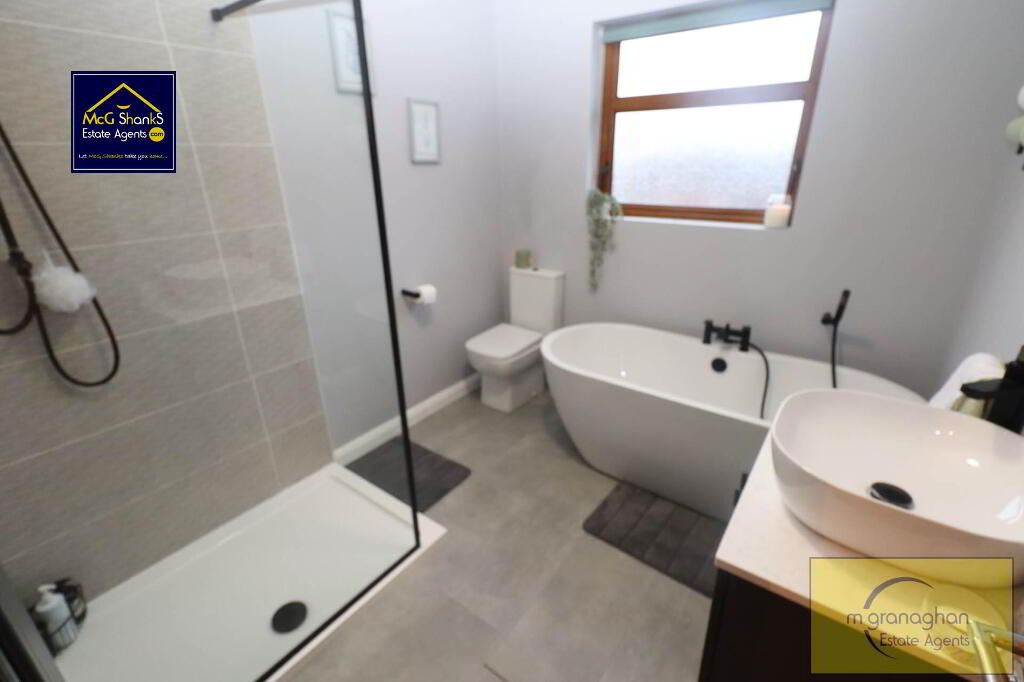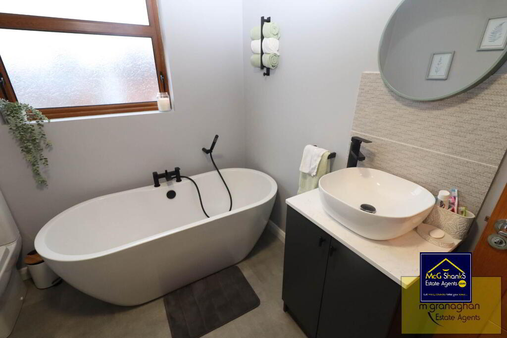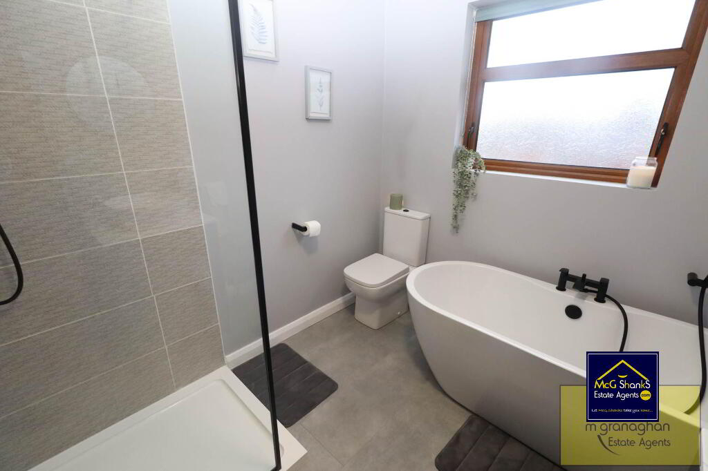 Upstairs, the property comprises three well-proportioned bedrooms, each benefiting from double glazing and gas central heating, ensuring warmth and comfort throughout the year. The bathroom is tastefully finished with modern fixtures, including a free standing bath as well as walk in shower, a wash basin, and a WC, all presented in a clean and contemporary style.